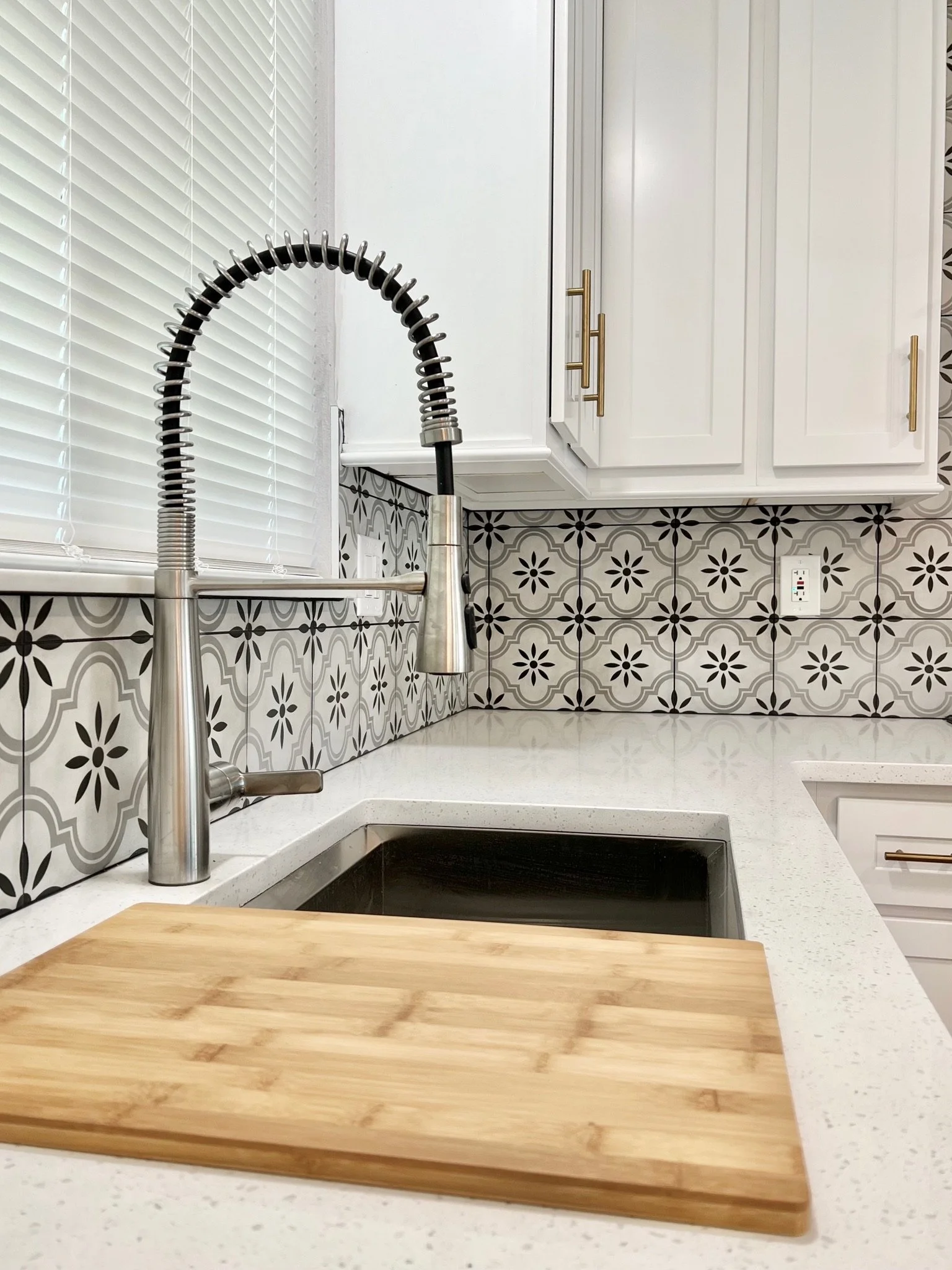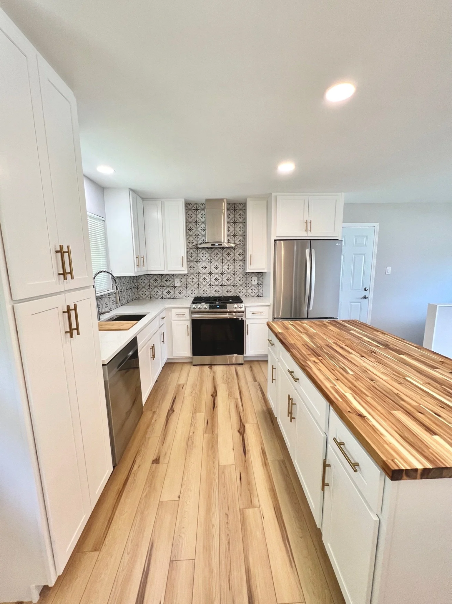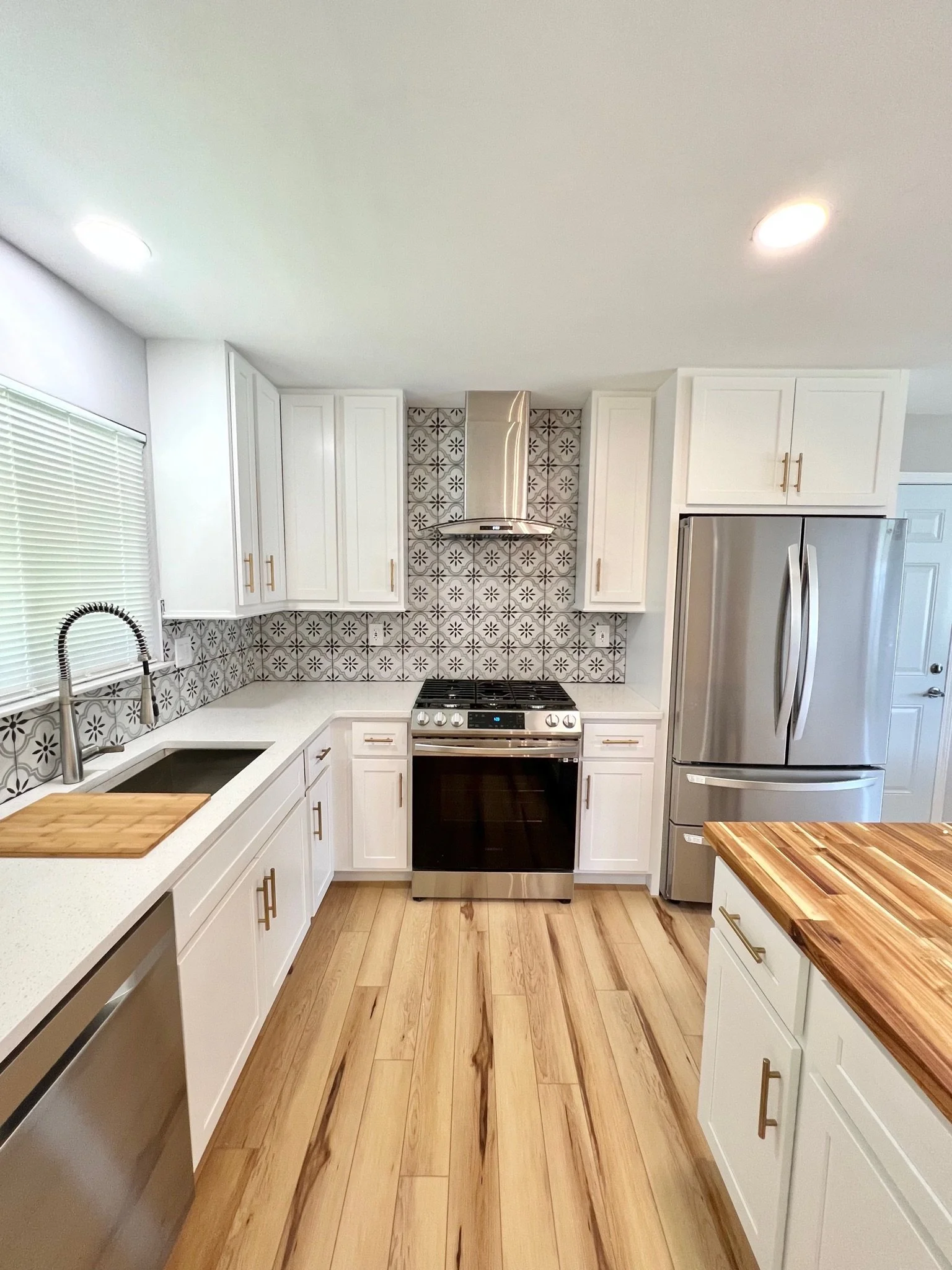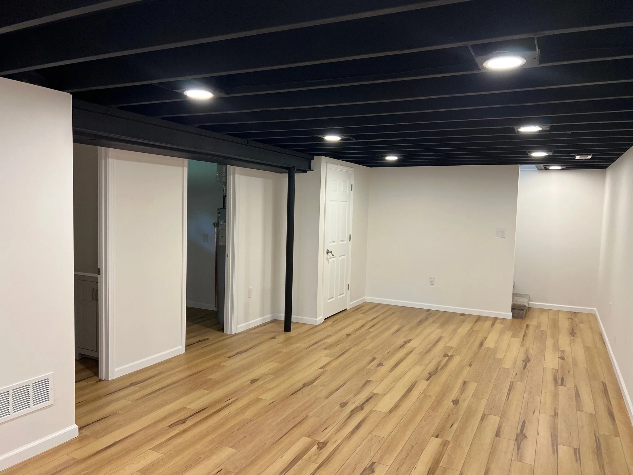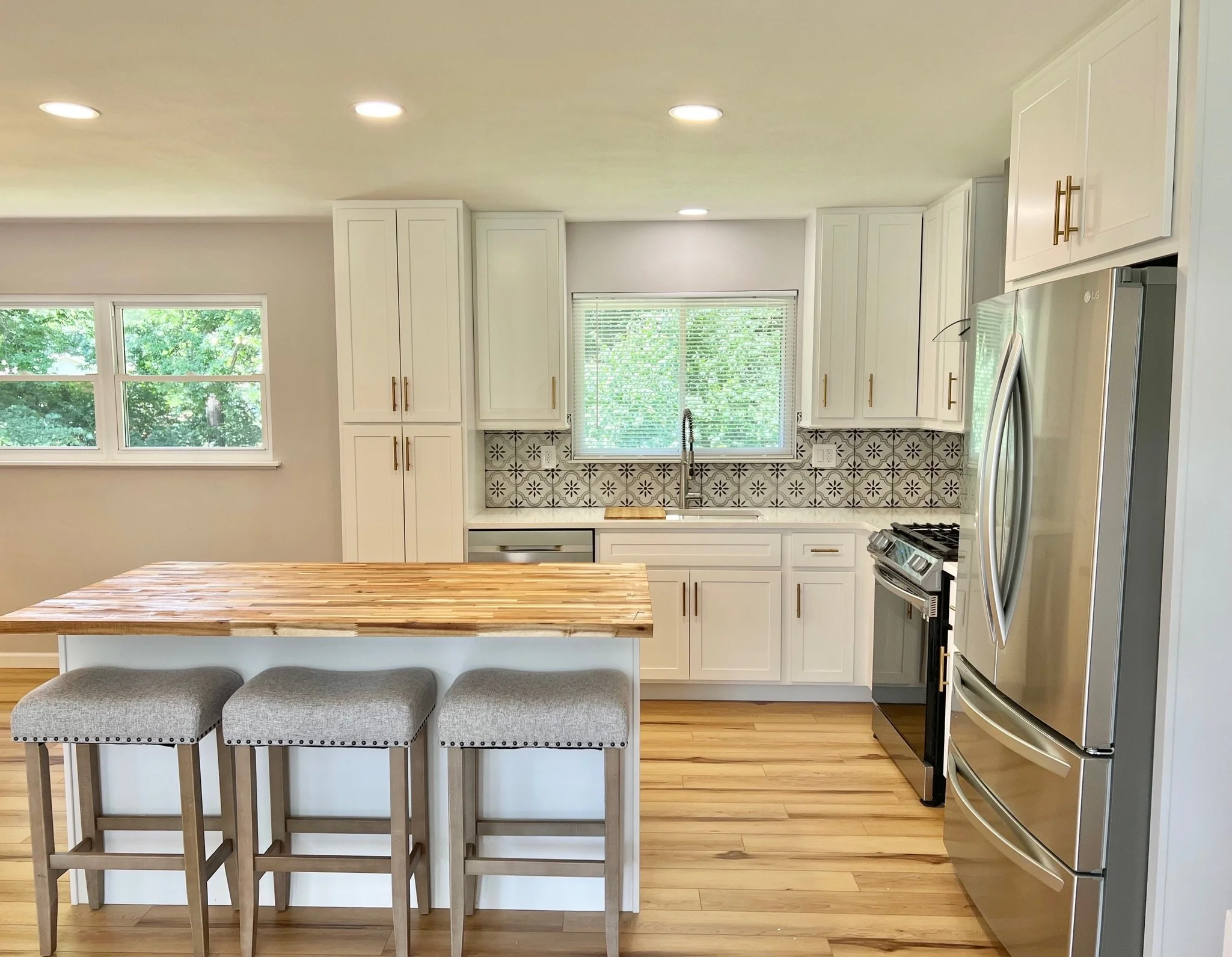 This 1960s home became a bright, airy retreat when we removed the wall between the kitchen and living room. A beach, luxury vinyl plank floor, gold accents, and a fun, retro tile backsplash in the kitchen gave the home an updated feel, while keeping the kitschy-cool vibe from it’s era. Quartz countertops paired with a Butcher-block island give the house a warmed-up feel without breaking the bank. Simple, modern and elegant furnishings make the space family-friendly but beautiful. And to tip the scales, the blacked-out rafters for the newly-remodeled basement gave the lower level a tall-pour feel while almost doubling the living space and allowing the residents to gain a bedroom and bath - not to mention the extra flex space for entertaining and family time. Check out our Before and Afters here.