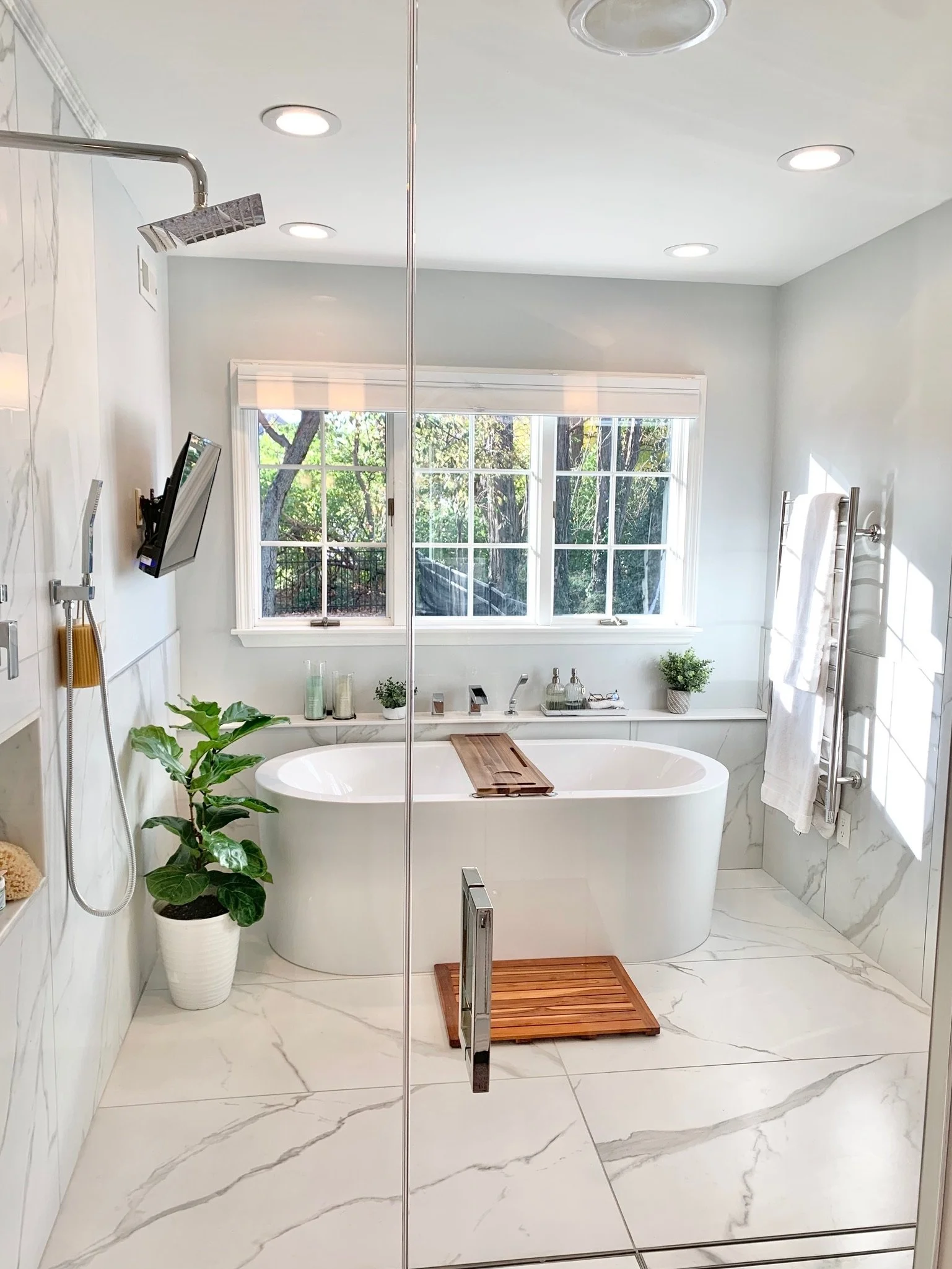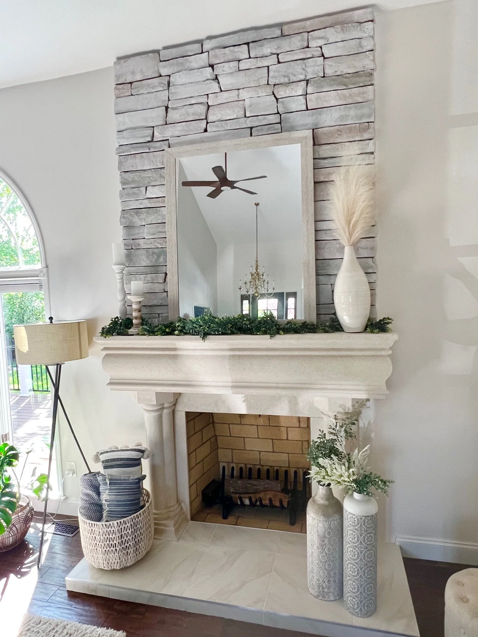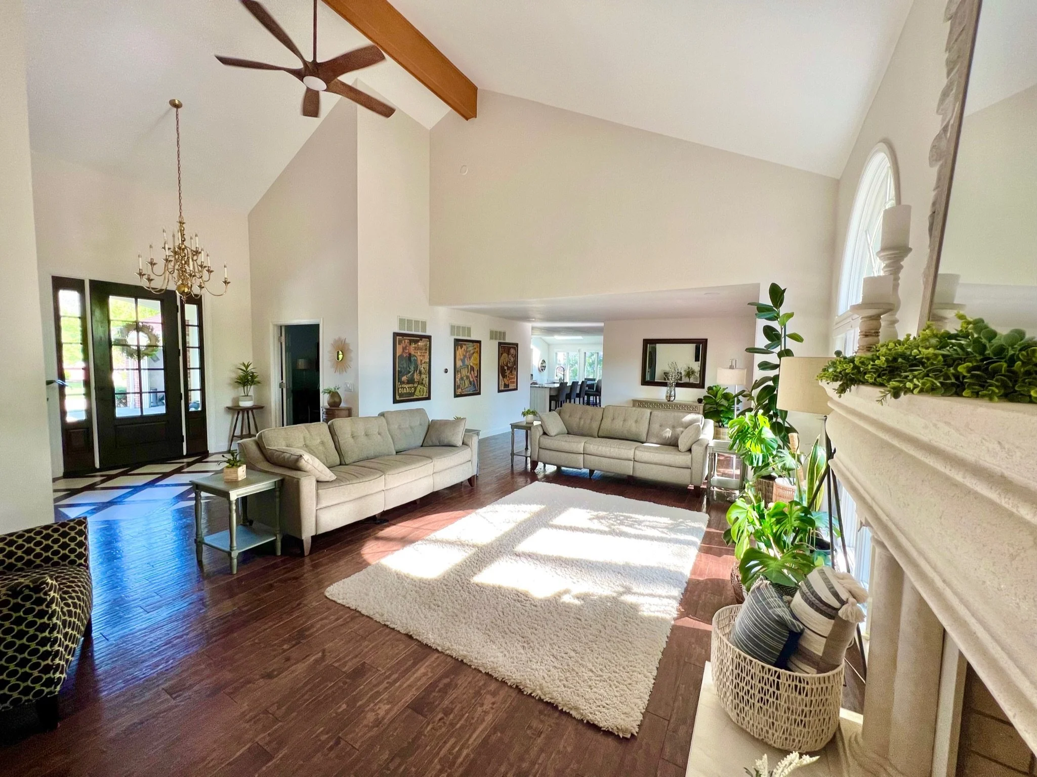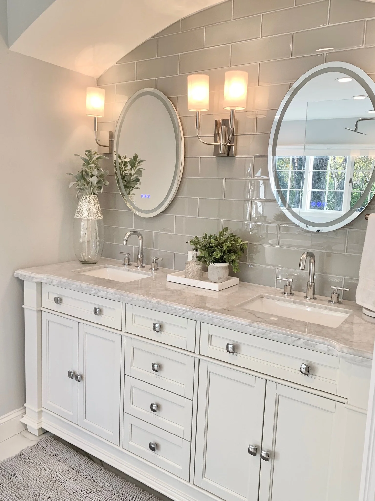 This 1980s residence had good bones but needed a modernizing facelift. In the main living area, we kept it light and bright, brought in some foliage and created an airy, yet comfortable space. The whitewashed fireplace, custom inlay foyer, and play on textures made the space cozy but elegant. We converted the master bath into a wet room with jetted tub and two-person shower and added a custom cove for the vanity. We took out the soffits and sun porch in the kitchen, allowing more space for the large island and plenty of room to move around (even when all your guests are gathered there)! Check out our Before and Afters here.